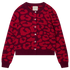 100% merino wool heavier-weight leopard jacquard round-neck cardigan in burgundy and red.