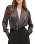 A new spin on a favorite. The Better Off Bodysuit takes the best parts of the best-selling Date Blouse (silky satin, blouson crossover styling) and gives it a fresh look with pleated zip cuffs.