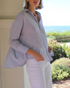 Its lightweight and breathable cotton fabric make it ideal for layering over your swimsuit, or wearing open over a tank. The drop shoulder offers a more relaxed and roomy fit. Fits oversized, best to size one size down from your normal size.