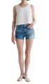 The Halle Patchwork Short is a high-rise style with a relaxed fit and a 4” inseam. Crafted from Italian non-stretch denim in a light blue wash, it features raw hems, five-pocket styling, and a patchwork design in contrasting lighter shades for added dimension.