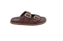 Brown woven raffia slide sandals with adjustable gold-tone buckles, a cushioned footbed, and a sturdy sole. A breezy, laid-back style perfect for warm-weather outings.